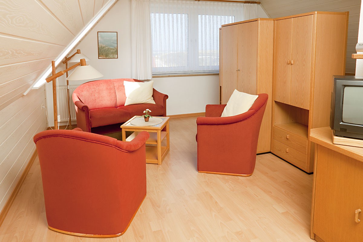 Schlafraum mit zwei Einzelbetten (90 x 200) und Platz für ein Kinderbett. • Wohn-Schlafraum mit Doppelbett (180 x 200), 2er-Sofa und 2 Sessel, Sat-TV, Eßtisch für vier Personen. • Küche: Spülmaschine, Kühlschrank, Herd mit 2 Platten, Mikrowelle, Kaffeemaschine, Wasserkocher, Toaster, Koch- und Eßgeschirr für vier Personen. •